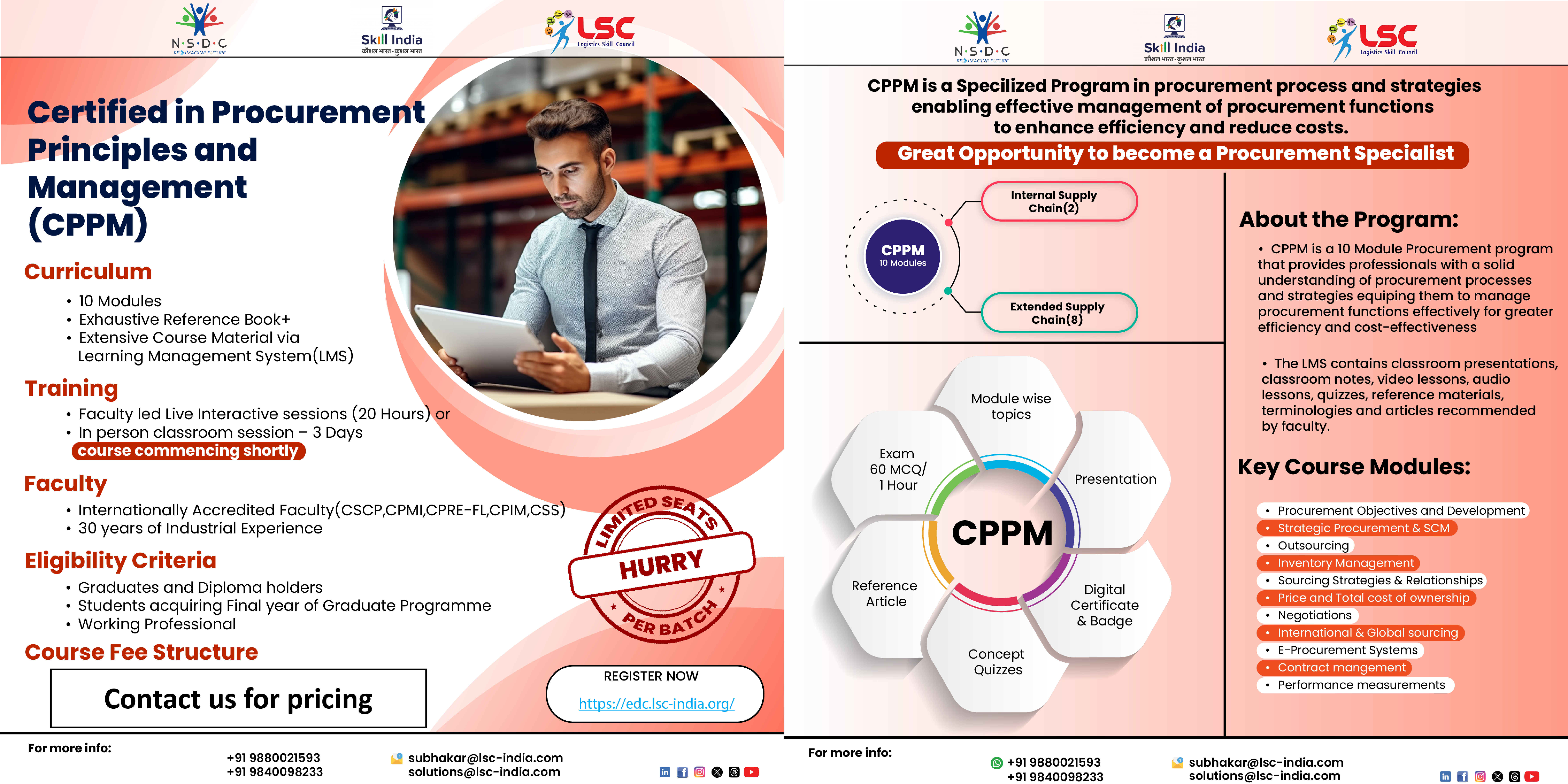 Certified in Procurement and Principles Management (CPPM) certification is designed for professionals who want to advance their knowledge and skills in procurement and supply chain management. This program provides in- depth training on the principles and best practices of procurement, from strategic sourcing to supplier management and ethical procurement practices. The certification is ideal for professionals seeking to excel in the procurement field and enhance their ability to manage procurement operations effectively.